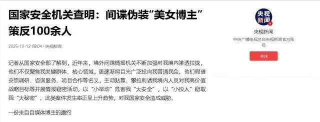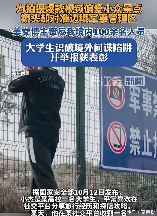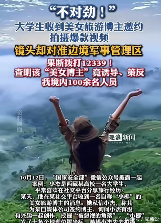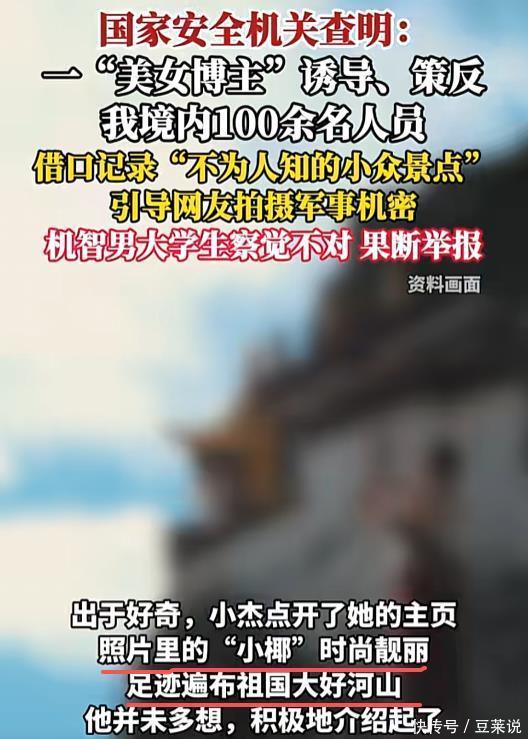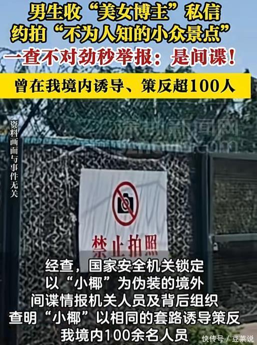 这些人看似是在分享风景,实则是在打一些敏感信息的主意。 10月12日,央视新闻重磅曝光一起间谍案,账号名为“小椰”的“美女旅行博主”,竟是境外间谍情报机关安插在境内的“眼睛”。 “小椰”凭借精心打造的网红人设,在境内策反百余人盗取军事机密,最终因一名大学生的警惕被连根拔起。