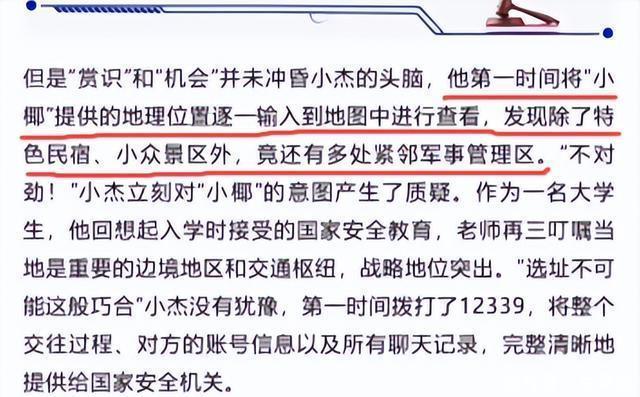 对于仍在求学阶段的小杰而言,对方所说的这些待遇无异于“天上掉馅饼”。 但是当“小椰”将需要拍摄的几个地点发给小杰后,小杰习惯性的在地图上寻找地点,却没想到这几个地点竟然都紧邻这军事管理区这种敏感地方。 之后他更是想起入学时的国家安全教育知识,随即变得更加警惕起来,他悄悄截下聊天记录,把对方账号ID和坐标信息记录下来。